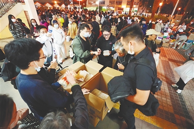 11月27日,义工在宏福苑附近向受火灾影响的市民派发物资。新华社发