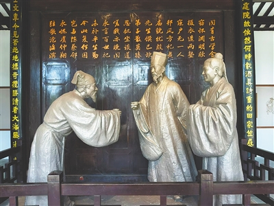 在儋州东坡书院,黎子云热情欢迎东坡父子来访(塑像)。