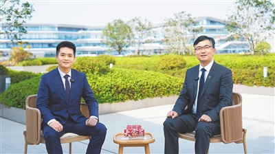 方明(右)接受《自贸港“大家”谈》节目组专访。