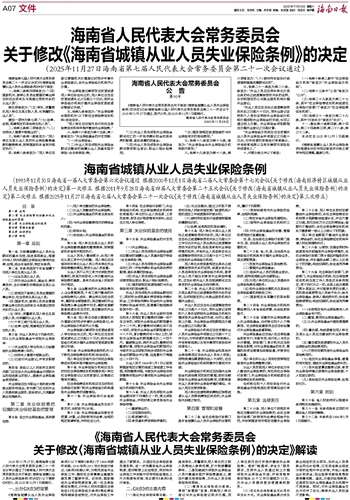 《海南省人民代表大会常务委员会关于修改〈海南省城镇从业人员失业保险条例〉的决定》已由海南省第七届人民代表大会常务委员会第二十一次会议于2025年11月27日通过,现予公布,自2025年12月1日起施行。
