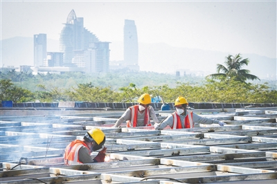 近日,三亚国际免税城三期项目现场,工人们在屋顶焊接钢结构。据悉,该项目首批次建设内容预计明年8月完工。目前,承建方中建二局正全力推进工程进度,冲刺今年底实现主体结构全面封顶。项目建成后将成为集高端购物、文化休闲、多元娱乐等功能于一体的大型商业新地标。海南日报全媒体记者 王程龙 摄