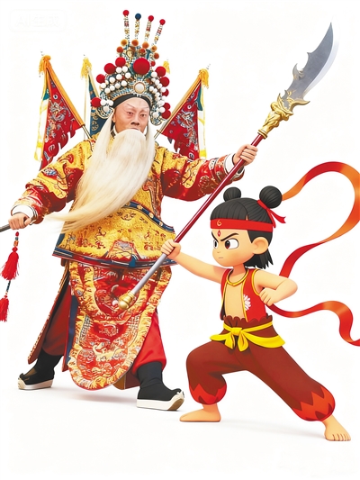 《传递》(电影《定军山》主演谭鑫培将道具交给中国动画电影IP哪吒)。AI生成/罗安明