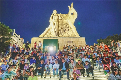在海南岛国际电影节期间,众多市民游客在三亚市鹿回头风景区观看露天电影。
