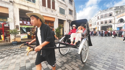 游客在海口市中山路骑楼老街坐“黄包车”。海南日报全媒体记者 张茂 摄