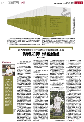 赵彦春:《全唐诗》中记载了2000多位作者的诗歌,白居易是其中现存诗歌数量最多的一位,创作水平高,堪称“世界级大师”。但他很多诗歌只以中文形式存在,传播度还不够。这种情况让人惋惜,所以我想通过英译把他的诗歌全景式介绍给全世界的读者。