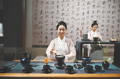 中国国家博物馆举办的建窑建盏文化展上,工作人员展示宋式斗茶。