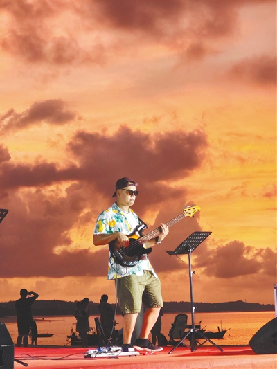 从初次登台的激动到掌控舞台的从容,“假日小镇”乐队的成长有目共睹。当被问及哪场演出状态最佳时,队员们不约而同想起2022年的国庆假期,在沙渔塘沙滩音乐秀上的演出。“那是我们第一次在海边公开演唱,没有紧张,只有激动,大家状态很好,还有很多观众跟我们互动。”汤国飞回忆道。作为舞台上的“C位”,这几年,他逐渐学会了控场,什么时候该停、什么时候继续,“主唱要根据现场氛围进行把控”。