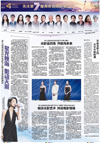 本报三亚12月3日电 (海南日报全媒体记者张琬茜 刘晓惠)南海之畔,星光熠熠。12月3日,第七届海南岛国际电影节在三亚开幕,众多重量级嘉宾齐聚一堂,共赴光影之约,进一步提升了本届电影节的观赏价值与业界影响力。当晚的开幕式上,演员陈宝国、蒋璐霞、江一燕、李乃文、吴倩、徐娇、谢瓦、张浩天、曾黎、何洛洛等,以及歌手吴宣仪、希林娜依·高、毕雯珺、蔡程昱、唐九洲等依次亮相,通过精彩的电影推介与演出,点燃了这场盛会的第一缕星光。