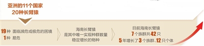 在亚洲11个国家的20种长臂猿中,有19种面临濒危或极危的困境,1种为易危。而海南长臂猿是其中唯一实现种群数量稳定增长的物种,目前7个族群共42只,5年增长了3个族群、12只个体。
