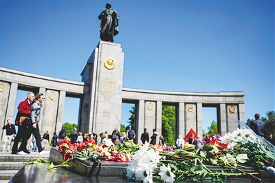 民众在德国柏林蒂尔加滕苏军纪念碑前放置鲜花。新华社/美联