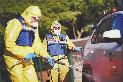 图为军事紧急部队成员在西班牙加泰罗尼亚自治区首府巴塞罗那的郊外开展防控工作。新华社/法新