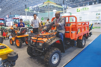 12月5日,在冬交会现场,国外嘉宾体验农具产品。