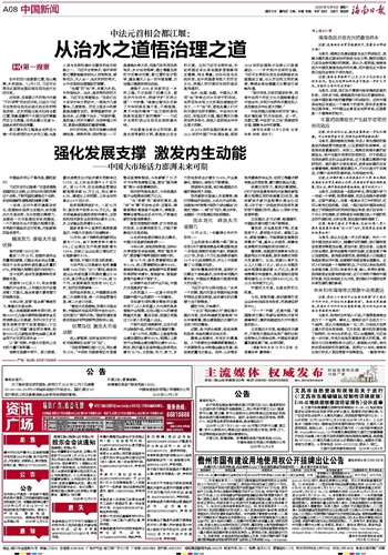 治水、治国、治理。中国古人常用“治”字表达对太平安宁的向往。世界百年未有之大变局加速演进的当下,一个“治”字,更饱含着人们对和平美好世界的期盼。中法作为有远见、有担当的大国,理应携手为推动世界多极化、促进人类团结合作作出更大贡献。