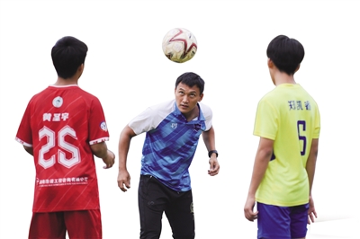 海南中学足球队主教练王存得(中)带着学生训练。他是今年“琼超”万宁队队员。海南日报全媒体记者 封烁 摄