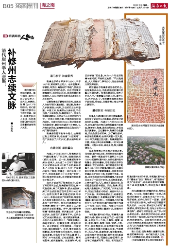 但是张嶲等人并未放弃修志之事。在光绪《崖州志》之前,有两种存世的崖州方志。最早一部是成书于康熙三十三年(1694)的康熙《崖州志》,由两任崖州知州张擢士、李如柏纂修,可惜目前仅存序及疆域志、艺文志两卷。第二部是成书于乾隆二十年(1755)的乾隆《崖州志》,由崖州知州宋锦、学正黄德厚纂修,在参考旧志的基础上扩充为十卷,体例趋于完备。但是,该志书的成书时间距张嶲等人修志时已过去了一百四十余年,其间物象更新、人事代谢不知凡几,倘若不亟加补述,恐怕很多史实都将湮没。因此,张嶲、邢定纶等人搜集史料,广采见闻,“以宋志为底本,而益以《通志》《府志》,遍启州中人士广为采拾。其间缺略者补之,纰缪者正之,繁芜者翦之,务期精益求精”(邢定纶《重修〈崖州志〉序》)。在张嶲等人的不懈努力下,这个版本的《崖州志》初稿于光绪二十七年(1901)写成。光绪三十四年(1908),经张嶲等人重新补订,定稿方才告竣。