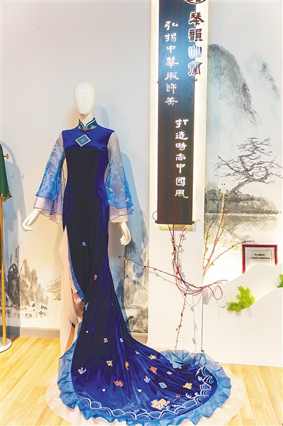 “这是同色系,这是对比色,这样搭配就显得和谐。”她从工作室的衣架上拿出一件旗袍,指着上面的色彩向记者讲解。