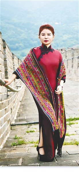 2025年7月,王彬妮身披黎锦披肩在北京长城留影。