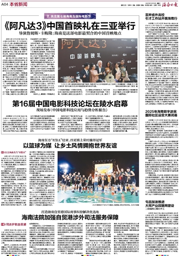 本报三亚12月8日电(海南日报全媒体记者李艳玫 实习生陈婉茹)12月8日,第七届海南岛国际电影节期间,《阿凡达3》中国首映礼在三亚举行。导演詹姆斯·卡梅隆携女主角佐伊·索尔达娜亮相,中国版配音演员章子怡、邓超、孙俪、黄轩一同出席,与影迷分享电影拍摄与配音的台前幕后故事。据介绍,《阿凡达3》延续了系列对自然、家庭与文明的深刻思考,视觉呈现与情感表达全面升级。影片在三亚的首映,不仅是一场电影盛会,也是海南文旅融合发展的生动体现,进一步彰显了海南作为国际影视文化交流平台的独特魅力。