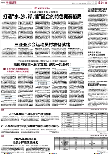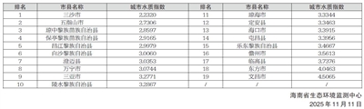 按照《地表水环境质量标准》(GB3838-2002)、《地表水环境质量评价办法(试行)》(环办〔2011〕22号)、《地级及以上城市国家地表水考核断面水环境质量排名方案》(环办监测函〔2024〕61号)和《城市地表水环境质量排名技术规定(试行)》(环办监测〔2017〕51号)等评价,2025年1-10月,全省地表水总体水质为优,监测的193个断面(点位)中:水质优良(Ⅰ~Ⅲ类)断面(点位)占96.9%,无劣V类断面。19个市县水环境质量按由好至差排名分别为:三沙市、五指山市、琼中黎族苗族自治县、保亭黎族苗族自治县、昌江黎族自治县、白沙黎族自治县、澄迈县、万宁市、三亚市、陵水黎族自治县、琼海市、定安县、海口市、屯昌县、乐东黎族自治县、儋州市、临高县、东方市、文昌市。详见右表: