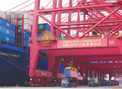 12月2日,在宁波舟山港梅山港区,塔吊吊起今年第4000万个集装箱。宁波舟山港近年来发展不断提速,货物吞吐量已蝉联16年全球第一。新华社发