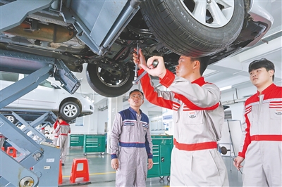 海南省机电工程学校内,汽车运用与维修专业的学生们在教学车间内进行汽车多种类维修实操学习。近年来,该校深入推进产教融合、校企合作,通过订单式培养、定向输送等模式,实现了人才培养与产业需求的精准对接。海南日报全媒体记者 封烁 摄