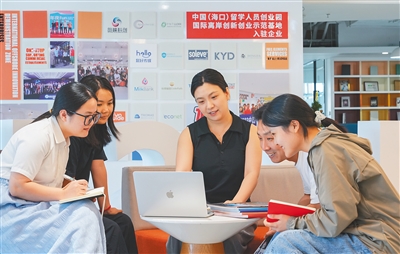 位于海口复兴城园区的中国(海口)留学人员创业园内,知行见(海南)教育科技有限公司工作人员在讨论留学国家优秀案例。该公司去年落地海口后,积极与海南热带海洋学院等院校建立战略合作,开展来华留学和签证服务,助力海南自贸港国际化人才建设。海南日报全媒体记者 张茂 摄