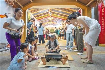不远处的海口非遗展示馆同样人气颇旺。海南椰雕、黎锦、草编等非遗项目通过实物、图文、数字多媒体等方式在此集中呈现,让市民游客可以“一站式”了解海南非遗。去年展馆升级后,这里从“只能看”变为“可以买”,人们既能观赏非遗代表性传承人的精湛技艺,也能选购椰雕手工艺品等,进一步满足市民游客文化消费需求。
