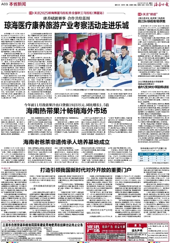 本报博鳌12月13日电(海南日报全媒体见习记者陈美如)12月13日,在2025琼海博鳌马拉松暨全国职工马拉松(博鳌站)开跑之际,琼海医疗康养旅游产业考察活动在乐城国际医疗旅游先行区开展,来自多个省份的医疗康养企业家代表、工会系统劳模职工疗休养单位代表及参赛选手等齐聚一堂,感受琼海医疗康养魅力,共商合作机遇。考察团首先走进博鳌乐城“永不落幕”国际创新药械展,参观前沿药械技术与创新医疗产品,直观感受自贸港医疗产业的蓬勃活力。随后,大家先后考察了树兰(博鳌)医院、颖奕国际医疗中心、海南梅赛尔医院、瑞金海南医院等优质医疗康养机构,详细了解机构的设施配置、服务体系及疗休养产品,对琼海医疗康养的专业水准与特色优势给予高度认可。