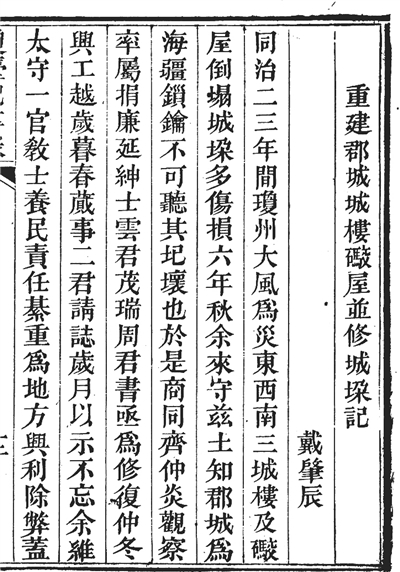 书中《重建郡城城楼炮屋并修城垛记》一文,则记录这样一件事:同治二、三年(1863-1864年),琼州遭遇大风灾害,郡城东、西、南三面的城楼全塌了,城垛也大多破损。数年后,戴肇辰来到琼州当知府,深知郡城城楼与城垛的重要性,不想任凭它破败下去,于是他带着下属们捐出自己的俸禄,又请绅士云茂瑞、周书两位先生牵头修复。同治六年十一月开工,次年春天就修完了。