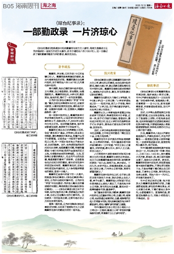 ■ 杨江波《琼台纪事录》是晚清琼州知府戴肇辰与地方文人撰写、海南文昌籍进士云茂济辑录的一部地方历史文化著作,成书于清同治八年(1869年)。这一古籍记录了循吏戴肇辰勤政为民的事迹,真实而生动。