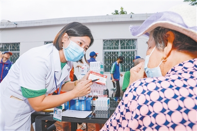 万宁开展“重阳敬老·党员先行”活动。图为万宁市人民医院医生为龙滚镇敬老院老人介绍健康知识。海南日报全媒体记者 袁琛 摄