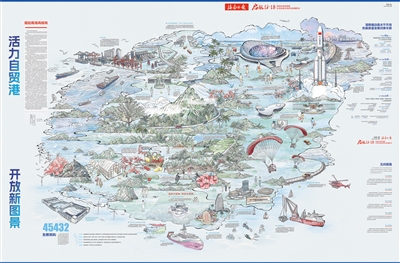 第二篇章为“活力自贸港 开放新图景”8连版特别报道。该篇章聚焦海南自贸港“三区一中心”战略定位,以及锚定“五向图强”打造新质生产力重要实践地的发展实践。在内容上,采撷自贸港建设中具有代表性的场景,丰富的画面元素和精美的手绘插画极具美感和冲击力。在设计上,8连版前后两面可上下拼接出一幅海南岛巨型手绘图,版面尺寸达1.5米×1米,整幅画面浓墨重彩、大气磅礴,为读者呈现活力四射、开放包容的自贸港新图景。