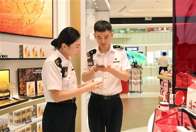①海口海关所属三亚海关关员在三亚国际免税城开展巡查。新华社发