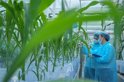 ①全球动植物种质资源引进中转基地隔离检疫圃内,工作人员在检查从国外引进的玉米植株幼苗长势。海南日报全媒体记者 王程龙 摄
