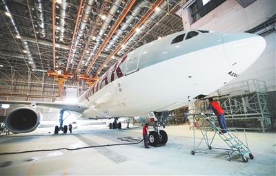 ② 海南自贸港一站式飞机维修产业基地,工作人员对一架卡塔尔籍客机进行维修。