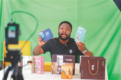 ① 在海口市复兴城数据跨境流动示范基地,来自尼日利亚的乌斯曼在直播销售海南产品。