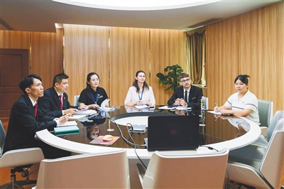 海南自由贸易港第二国际商事法庭法官与外籍调解员在线上调解一起国际商事纠纷。周邢起佳 摄