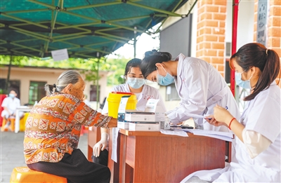 白沙黎族自治县青松乡卫生院医务人员在拥处村开展“2+3”健康服务包工作,采集村民血液样本进行检测,让老百姓在家门口看好病。 海南日报全媒体记者 李天平 摄