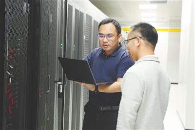 基础设施和安全处吴祖顺(左)在省政府数据中心机房检查网络设备。