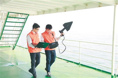 运营商工作人员在跨琼州海峡轮渡上测试优化网络。