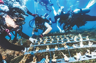 2025年世界海洋日主题宣传活动在三亚大东海举行。图为志愿者们潜入海底种植珊瑚苗。