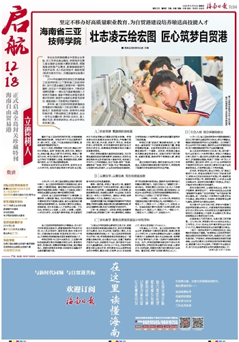 一批又一批的优秀学子从学院走向社会,走出精彩的技能成才道路。“将海南省三亚技师学院打造成全国百所技师学院示范校,将是我们近几年的发展目标。”严琼表示,学院将把海南自贸港的发展战略、企业岗位需求以及学院自身的实际情况相结合,继续着力优化专业结构,不断提升专业建设水平,努力为社会培养更多优秀的高素质技能人才!(本报三亚12月17日电)