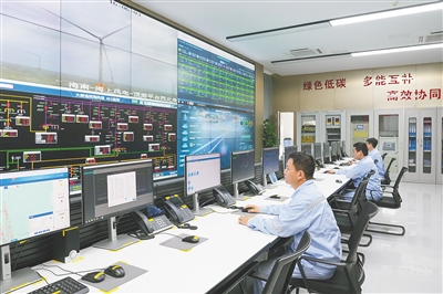 在大唐儋州120万千瓦海上风电项目陆上集控中心,工作人员在监控机器运行状态。
