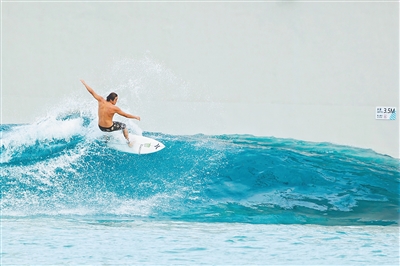 在中旅逐浪度假区,一位冲浪爱好者在人工造浪池里冲浪。(中旅供图)