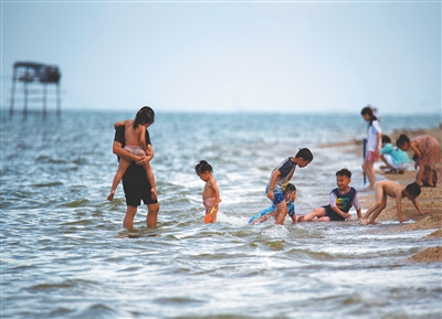 游人在潭门镇海滨消夏游乐。