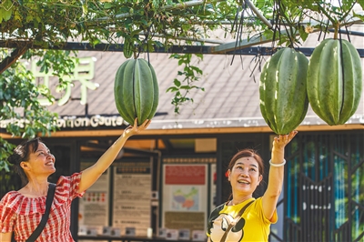 ③游客在琼海市世界热带水果之窗观赏新奇瓜果。