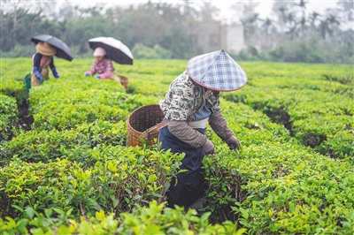 在白沙黎族自治县原生态茶园小镇的万亩茶园基地里,茶农忙着采茶。海南日报全媒体记者 李天平 摄
