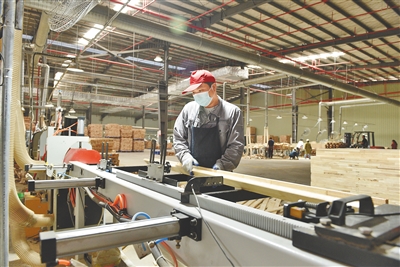 在大同产业园的福成实业(海南)有限公司木材精加工区,工人在加工木材。