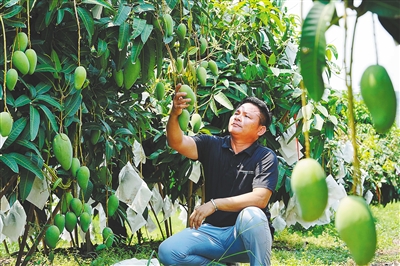 陵水光坡镇芒果种植基地,农户查看芒果长势。(资料图)