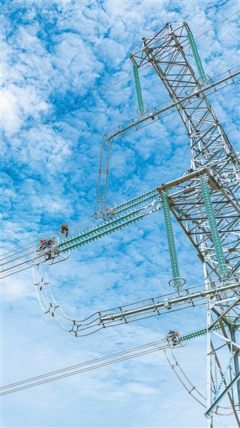 海南电网公司工作人员在海南500千伏三亚输变电工程项目线路上作业。吴清炳 摄